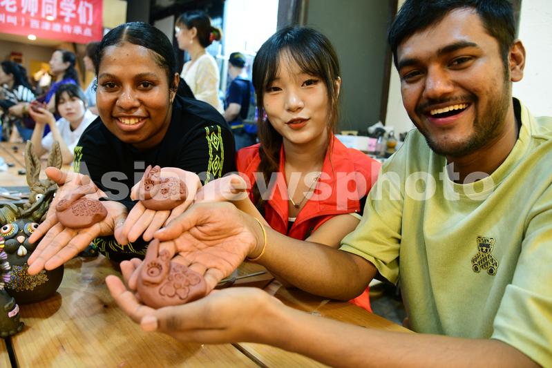 2023年8月20日,在江苏省镇江市“太平泥叫叫”体验馆,几名江苏大学的中外大学生在展示制作的泥叫叫“生肖兔”。