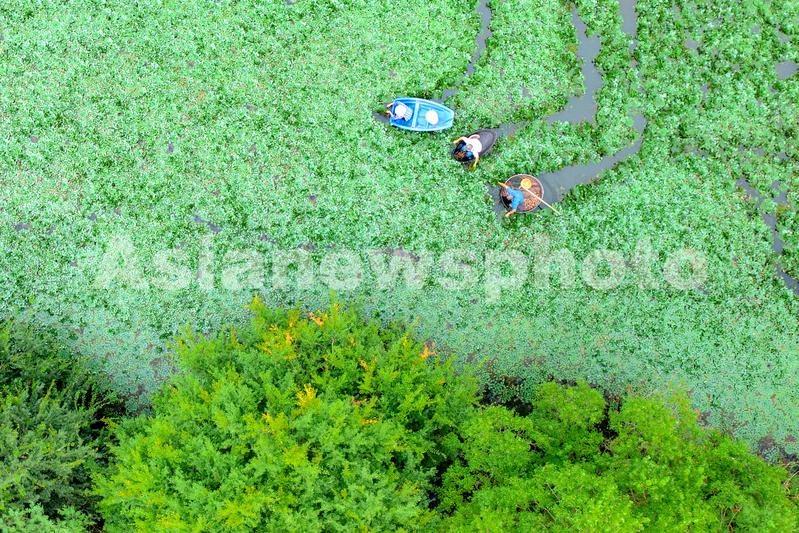 2023年8月22日,浙江省湖州市长兴县和平镇横山村,村民划着菱桶采摘菱角。