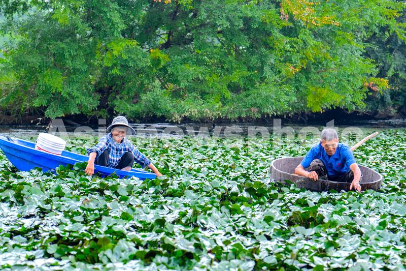 2023年8月22日,浙江省湖州市长兴县和平镇横山村,村民划着菱桶采摘菱角。