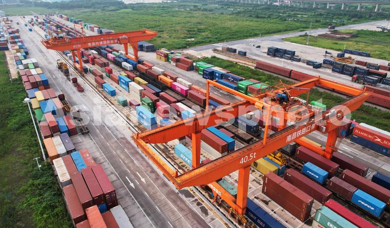 2023年8月22日,一列由52节车厢组成,满载汽车零配件、医疗器械、服装等货物的班列从南昌国际陆港驶出,驶向浙江宁波北仑港。据了解,今年1-7月,南昌国际陆港开行外贸班列920列,65526个标箱,货值约16.9975亿美元,分别同比增长43.97%、71.72%、70.05%,为江西制造的优质产品走向世界提供了一条低价、便捷的大通道。