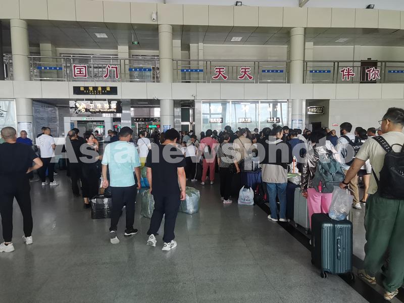图片说明:2023年8月24日,中国旅客在黑河口岸排队等待验放出境。