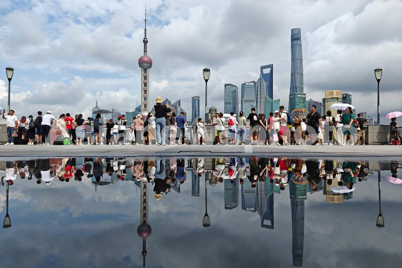 2023年8月23日,上海外滩景区游客众多,天空中云系丰富多变,城市风景格外优美。