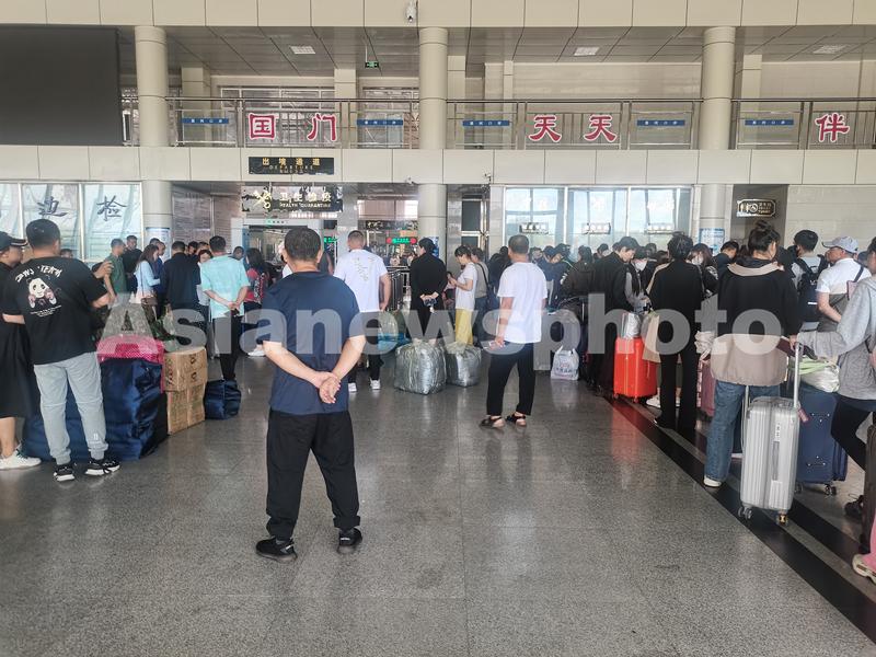 图片说明:2023年8月24日,中国旅客在黑河口岸排队等待验放出境。