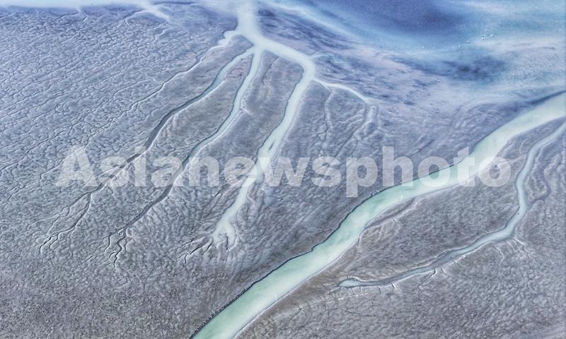 图片说明:2023年8月24日,在长江江苏省张家港湾江滩,无人机拍摄的“潮汐树”自然景观。