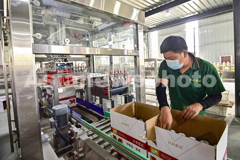 图片说明:2023年8月25日,在山东省青州市经济开发区一家农药制造企业车间内,工人在生产线上忙碌。