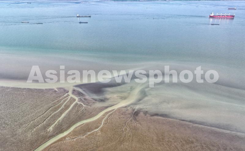 图片说明:2023年8月24日,在长江江苏省张家港湾江滩,无人机拍摄的“潮汐树”自然景观。