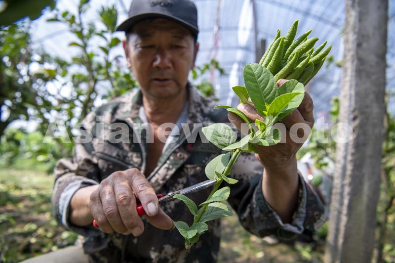 图片说明:2023年8月25日,在浙江省金华市金东区赤松镇北山口村的佛手基地里,工人们正忙着采摘新鲜佛手。