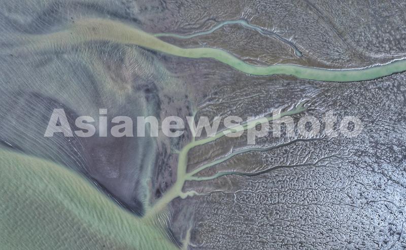 图片说明:2023年8月24日,在长江江苏省张家港湾江滩,无人机拍摄的“潮汐树”自然景观。