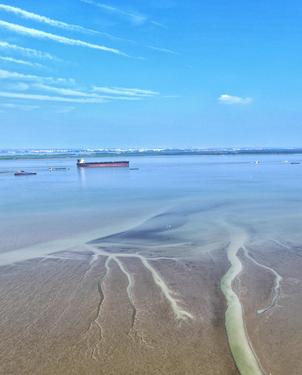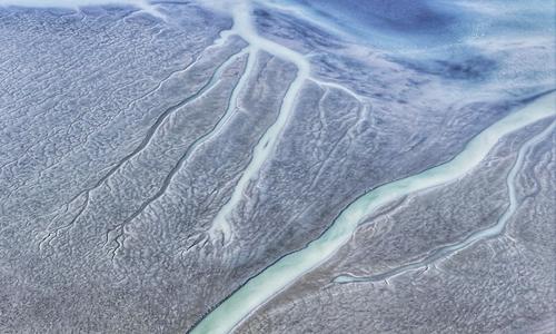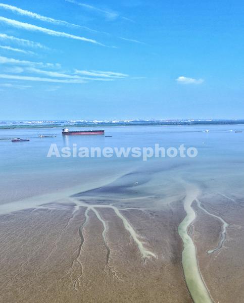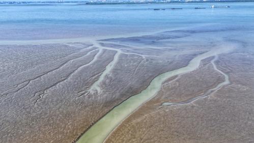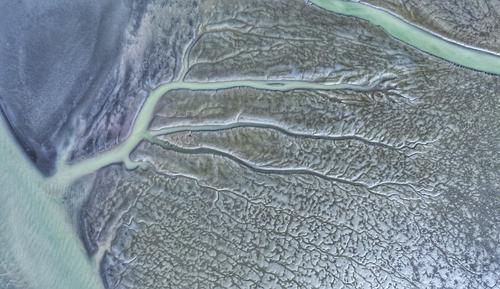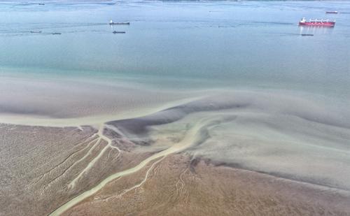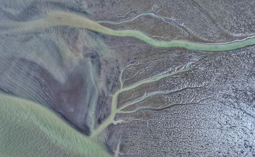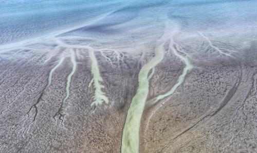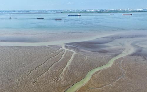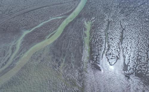 图片说明:2023年8月24日,在长江江苏省张家港湾江滩,无人机拍摄的“潮汐树”自然景观。