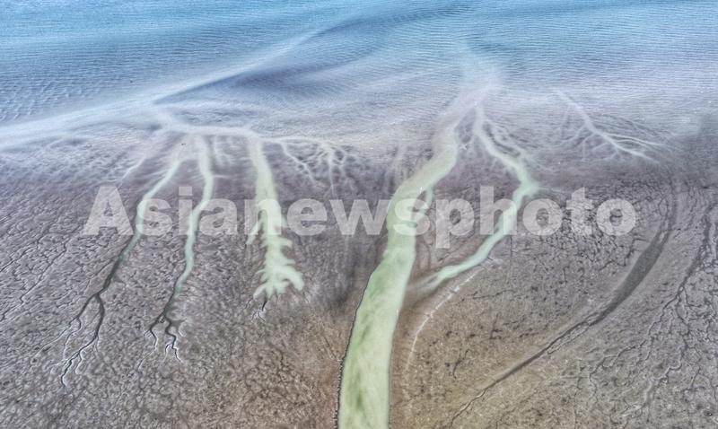 图片说明:2023年8月24日,在长江江苏省张家港湾江滩,无人机拍摄的“潮汐树”自然景观。