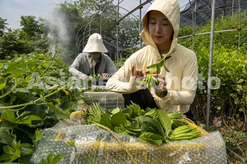 图片说明:2023年8月25日,在浙江省金华市金东区赤松镇北山口村的佛手基地里,工人们正忙着整理刚刚采摘的新鲜佛手。