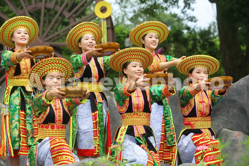 2023年8月24日,湖南省邵阳市隆回县花瑶同胞在“讨僚皈”民俗风情节上表演传统节目——“拦门酒”。