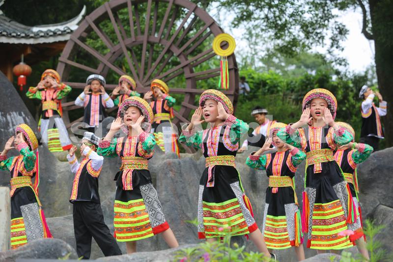 2023年8月24日,湖南省邵阳市隆回县花瑶学生在“讨僚皈”民俗风情节上高唱花瑶呜哇山歌。