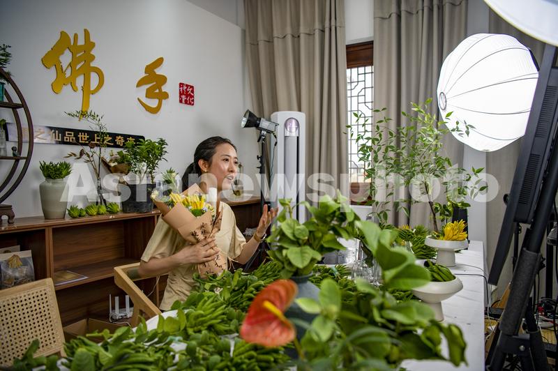 图片说明:2023年8月25日,在浙江省金华市金东区赤松镇北山口村文旅会客厅的直播间内,“新农人”在直播销售新鲜佛手。