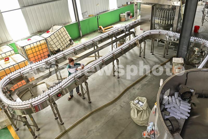图片说明:2023年8月25日,在山东省青州市经济开发区一家农药制造企业车间内,工人在生产线上忙碌。