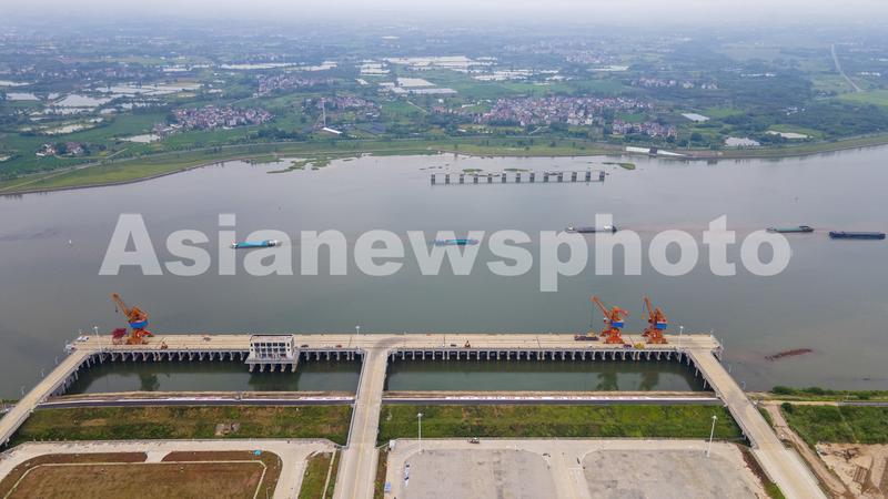 2023年8月28日,俯瞰浙江省金华市金华港婺城港区刚刚建成投运的罗洋作业区水域,一队货运船舶正平稳驶过(无人机照片)。
