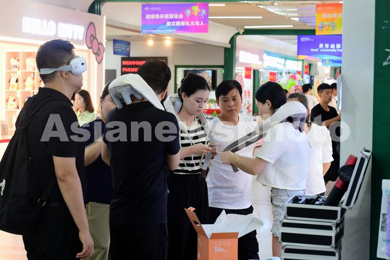 图片说明:2023年8月27日,浙江省金华市义乌国际商贸城,客商在洽谈、采购肩颈按摩仪。