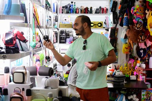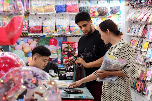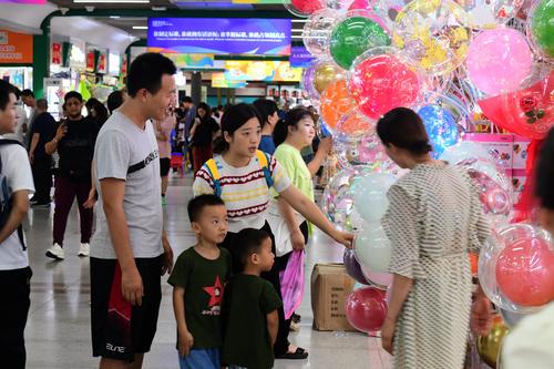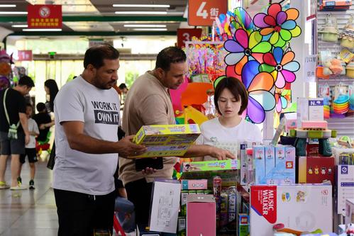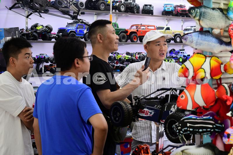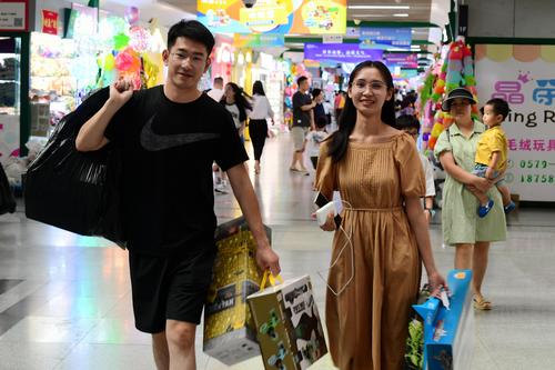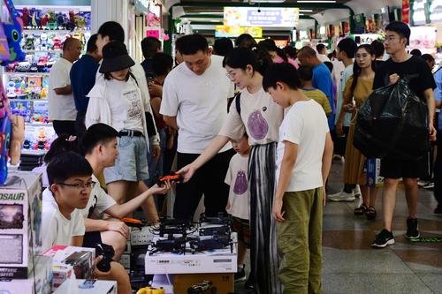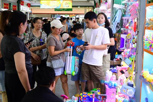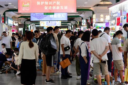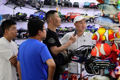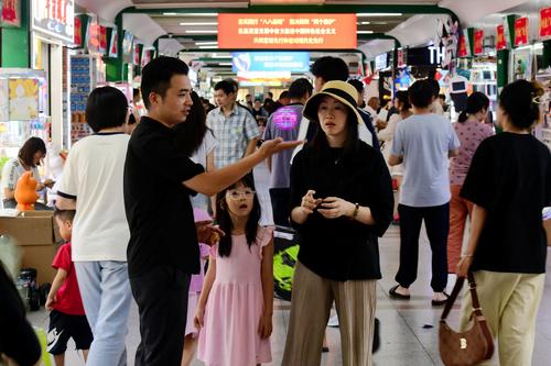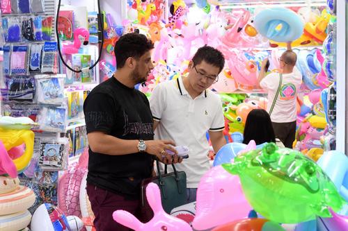 图片说明:2023年8月27日,浙江省金华市义乌国际商贸城,客商在洽谈、采购电动玩具。