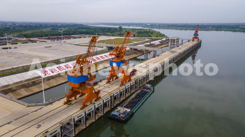 2023年8月28日,俯瞰浙江省金华市金华港婺城港区刚刚建成投运的罗洋作业区码头,装载钢材的船舶正在进行卸货作业(无人机照片)。