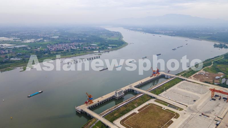 2023年8月28日,俯瞰浙江省金华市金华港婺城港区刚刚建成投运的罗洋作业区水域,一队货运船舶正平稳驶过(无人机照片)。