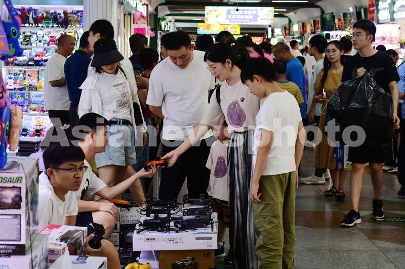 图片说明:2023年8月27日,浙江省金华市义乌国际商贸城,客商在洽谈、采购电动玩具。