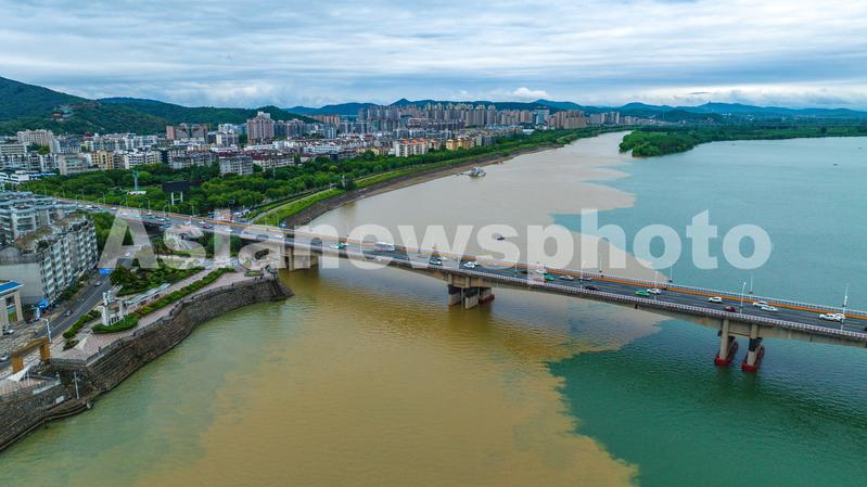 图片说明:2023年8月27日,湖北省襄阳市,汉江襄阳城区段“泾渭分明”景观。