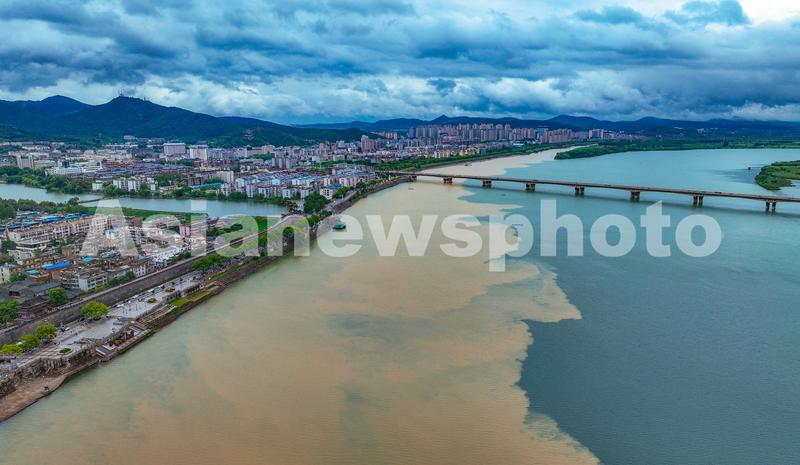 图片说明:2023年8月27日,湖北省襄阳市,汉江襄阳城区段“泾渭分明”景观。