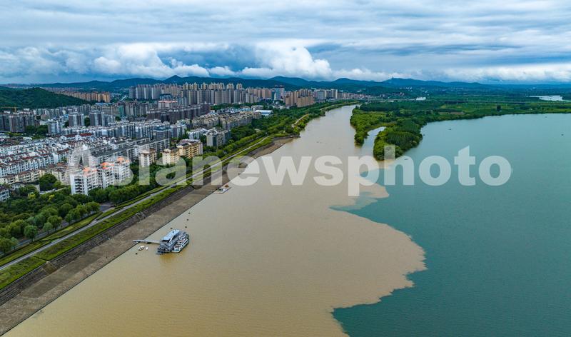 图片说明:2023年8月27日,湖北省襄阳市,汉江襄阳城区段“泾渭分明”景观。