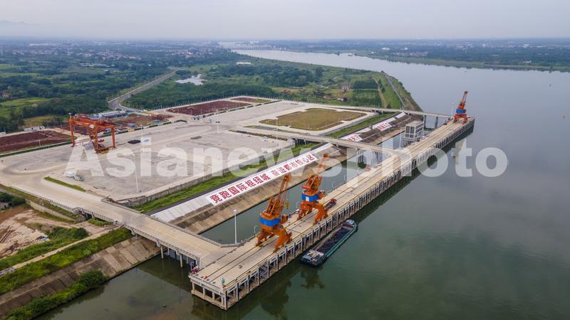 2023年8月28日,俯瞰浙江省金华市金华港婺城港区刚刚建成投运的罗洋作业区码头,装载钢材的船舶正在进行卸货作业(无人机照片)。