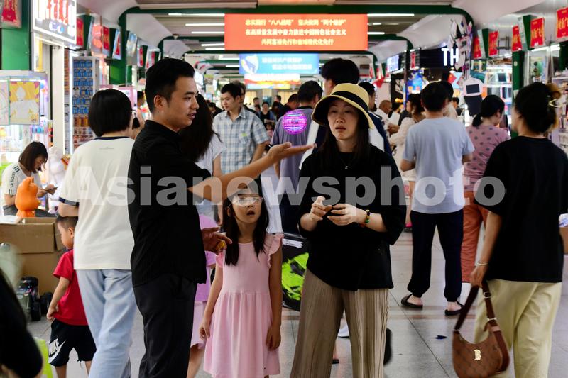 图片说明:2023年8月27日,浙江省金华市义乌国际商贸城,经营户正在向客商现场演示自动回旋飞球玩具。