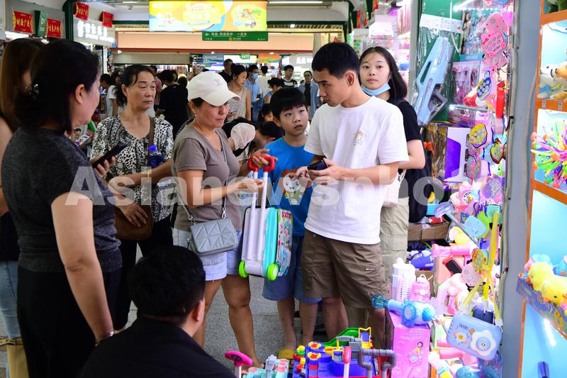 图片说明:2023年8月27日,浙江省金华市义乌国际商贸城,客商在洽谈、采购儿童用品。
