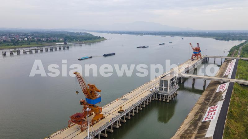 2023年8月28日,俯瞰浙江省金华市金华港婺城港区刚刚建成投运的罗洋作业区水域,一队货运船舶正平稳驶过(无人机照片)。