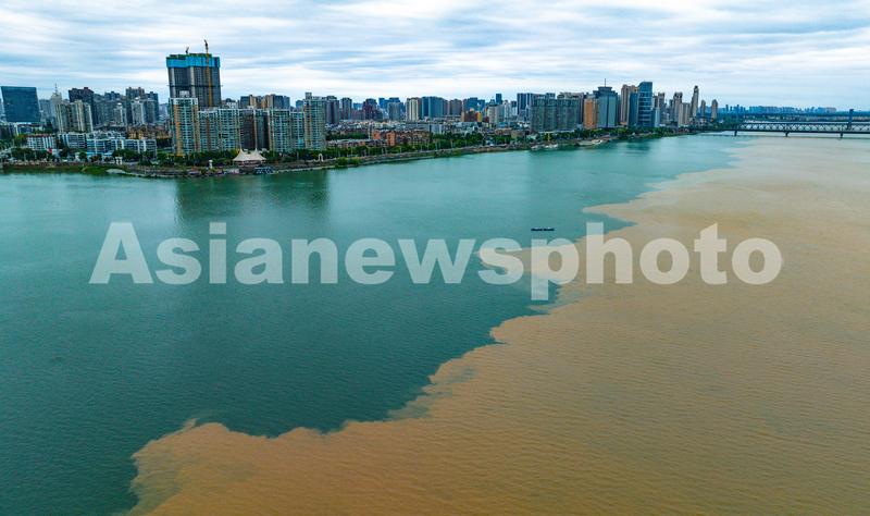 图片说明:2023年8月27日,湖北省襄阳市,汉江襄阳城区段“泾渭分明”景观。