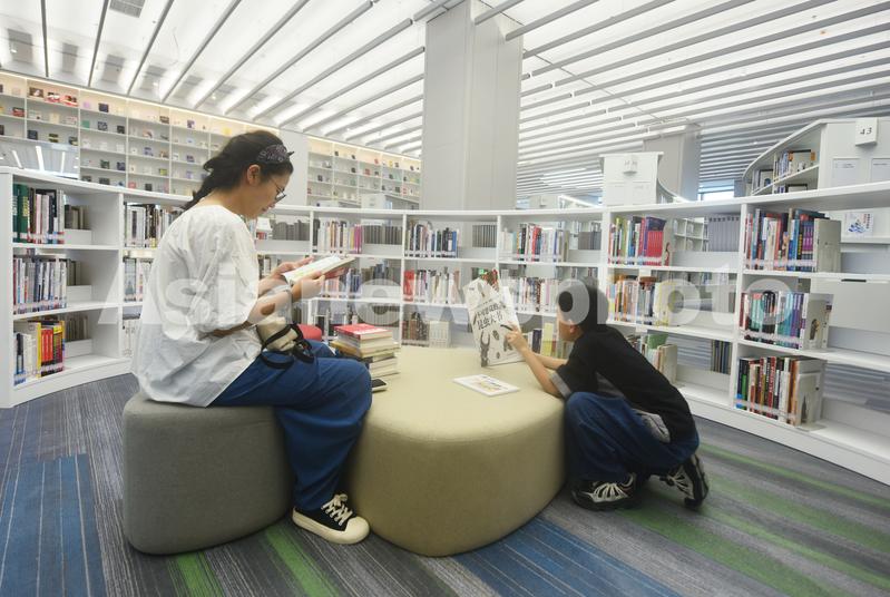 2023年8月29日,小读者和家长在浙江图书馆之江新馆一起阅读图书。