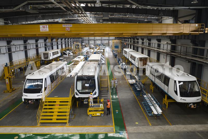 2023年8月31日,安徽省芜湖经济技术开发区的中车浦镇阿尔斯通运输系统有限公司车间里,工人在生产出口国外的无人驾驶轨道交通列车。