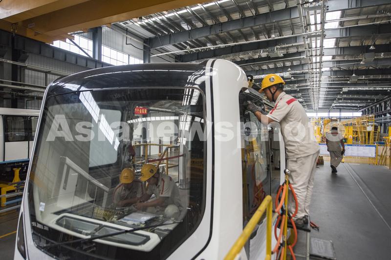 2023年8月31日,安徽省芜湖经济技术开发区的中车浦镇阿尔斯通运输系统有限公司车间里,工人在生产出口国外的无人驾驶轨道交通列车。
