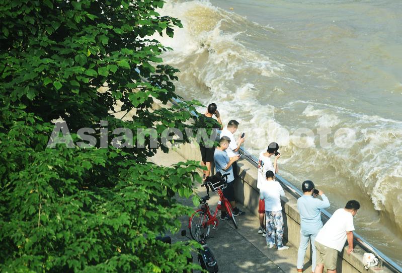 2023年9月3日,游客在钱塘江杭州段岸边观看“鬼王潮”。 当日是农历七月十九,钱塘江迎来俗称“鬼王潮”大潮汛,吸引了不少市民游客前往钱塘江杭州段岸边观看汹涌壮观的潮水。
