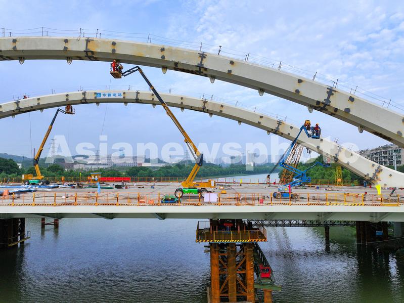 图片说明:2023年9月5日,建设者在江苏省南京市梅苑南路跨秦淮新河大桥抓紧作业。