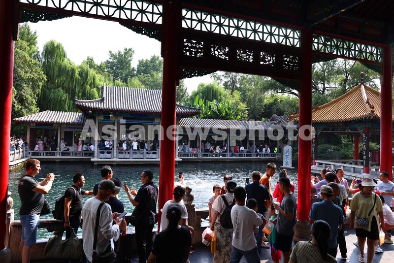 图片说明:9月3日,游客在山东省济南市趵突泉公园欣赏“趵突腾空”的美景。