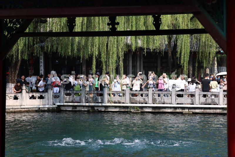 图片说明:9月3日,游客在山东省济南市趵突泉公园欣赏“趵突腾空”的美景。