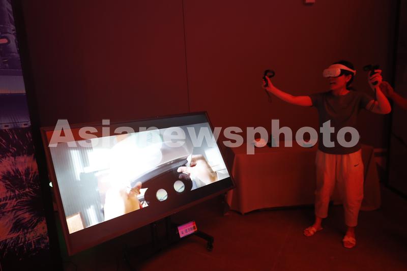 2023年9月2日,首钢园一高炉SoReal元宇宙乐园体验区33环廊展区,观众在体验AI数字VR游戏。