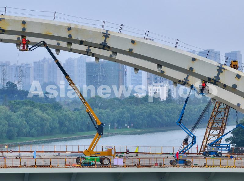 图片说明:2023年9月5日,建设者在江苏省南京市梅苑南路跨秦淮新河大桥抓紧作业。