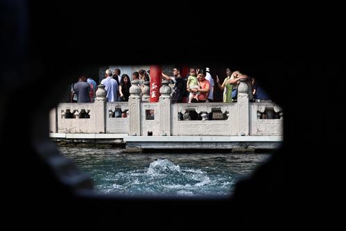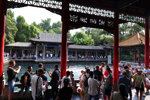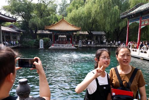 图片说明:9月3日,游客在山东省济南市趵突泉公园欣赏“趵突腾空”的美景。