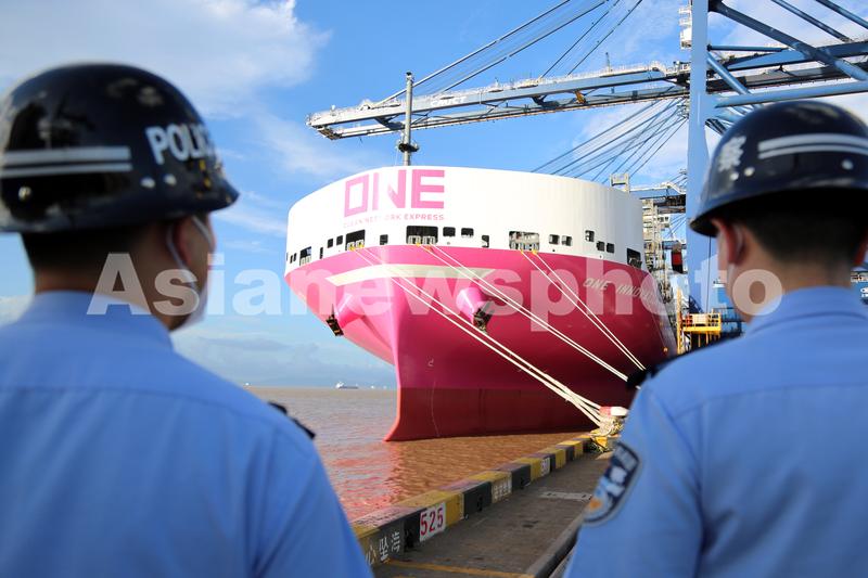 2023年9月3日,在浙江宁波出入境边防检查站执勤民警的监护下,利比里亚籍超大型集装箱船“第一创新”轮顺利靠泊宁波舟山港大榭港区集装箱码头。
