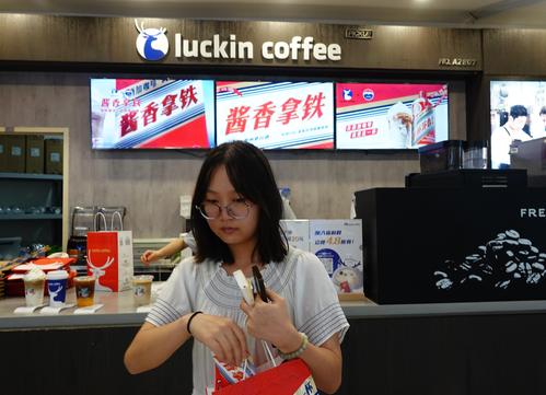 图片说明:2023年9月4日,湖北宜昌,市民在瑞幸咖啡店购买并展示“酱香拿铁”咖啡。