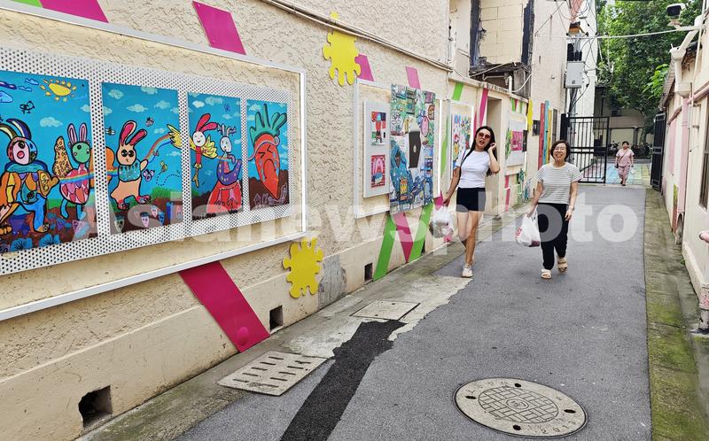 2023年9月5日,上海,申城首家社区弄堂美术馆“华漾美术馆”展出各种创意涂鸦墙绘及充满童趣的儿童原创艺术作品。