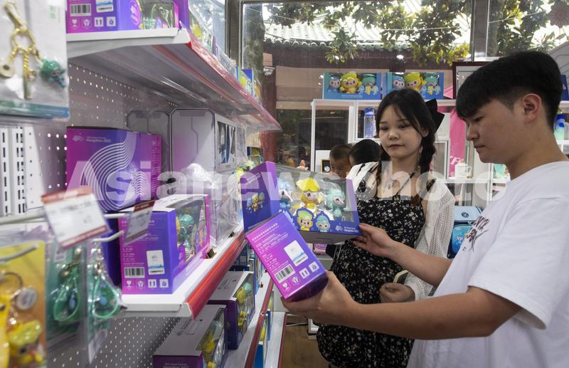 图片说明:2023年9月6日,在浙江省东阳市横店影视城景区杭州第19届亚运会特许商品零售店,游客选购各种亚运纪念品。