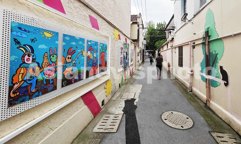 2023年9月5日,上海,申城首家社区弄堂美术馆“华漾美术馆”展出各种创意涂鸦墙绘及充满童趣的儿童原创艺术作品。