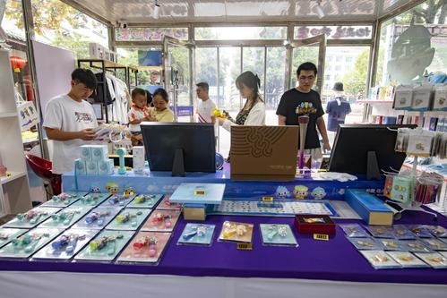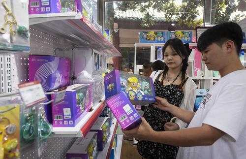 图片说明:2023年9月6日,在浙江省东阳市横店影视城景区杭州第19届亚运会特许商品零售店,游客选购各种亚运纪念品。