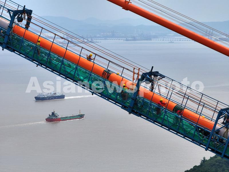 2023年9月6日,在浙江省舟山跨海大桥之一的西堠门大桥Á岛侧主缆上,工人们施工平台上为大桥主缆进行缠包作业。两条佛光黄的主缆更显大桥壮观。